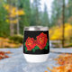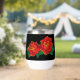 Two red roses in a backdrop of black all drawn in a tattoo style.