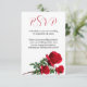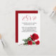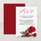 Red roses wedding reply card with photo on back. Ask guests to reply online to a website with these white, vertical cards that have a photo template on the back. Three red roses on stems with greenery decorate the bottom of the card. Black printed text for information with modern thin script for RSVP at the top.