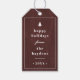 This rustic Christmas gift tag features a red vintage-inspired label design with space for the holiday greeting. There is a small pine tree illustration on top of the label, as well as a subtle woodgrain texture in the background. The back of the tag features a full-size photo.