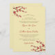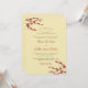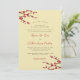 An original illustration of beautiful red cherry blossoms or sakura spring flowers with dark brown branches on a light yellow cream background. This is a modern double-sided wedding day invitation / wedding dinner reception card.