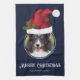Personalizable Christmas photo template design where a red Santa hat illustration by Destei is placed above a round photo. The Santa hat has a green Christmas Holly plant on it and the background colour is blue. Under the image there are two personalizable text areas.