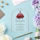 Invite your quinceañera guests in style with this elegant party invitation featuring a beautiful sparkly silver and wine red dress and your party details in grey typography calligraphy script for you to personalize bordered with faux aqua glitter on a see thru acrylic background. Designed by Susan Coffey.
