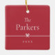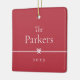 Sweet and simple Christmas ornament features a minimalist layout, with your family name and the year in clean, classic serif typeface on a festive red background. A petite bow through the centre completes the design. Add a photo to the reverse side, accented with a matching bow illustration.