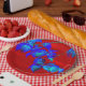 Red skies and Blue green leaves make a bold impression on these plates