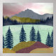 This gorgeous abstract landscape depicts a mountain scene with a lake and a multi colour sky in shades of red, cyan, blue, yellow and gold.