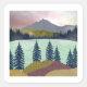 This gorgeous abstract landscape depicts a mountain scene with a lake and a multi colour sky in shades of red, cyan, blue, yellow and gold.