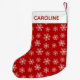 A pattern of white snowflakes on a red background. The top of the stocking is white with a custom name in matching red.