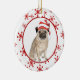 On the front of this Holiday ornament is a beautiful watercolor image of a Pug dog wearing a red and white striped Santa hat. The image is placed on a white circle framed by a retro red snowflake pattern. The back of the ornament has the same background and circle with your custom text in white on a matching red background. Cute, especially for someone who loves a Pug.