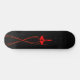 This skateboard features a red spaceship with its sleek and futuristic design standing out against a stark black background. The ship appears to be blasting off into space, leaving a trail of orange and red fire lines in its wake. Simplistic design reminiscent of old video space shooter games. This skateboard design is perfect for anyone who loves the thrill of space travel and the rush of skating. It's a sure-fire way to make a statement while tearing up the streets or the skate park.