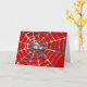 The web has a bright red background. This is a modern and colourful spider design, perfect for Halloween.