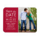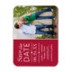 A modern and stylish save the date featuring a bold red typography panel alongside a full custom photo, separated by a decorative scalloped edge detail. Small heart accents frame the date for a sweet, romantic touch. Fully editable names, date, location, and website make this easy to personalize for any wedding style.