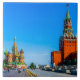 Red Square of Moscow in the summer evening. Red wall of the Kremlin (right), Spassky (Saviour's) tower (right) and St. Basil's cathedral (left). Soviet era viewing stand (right) to watch civilian and military parades.