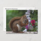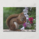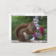 This postcard features an adorable red squirrel having a snack of sunflower seeds with a background of pink and white petunias and lovely greenery.