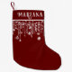 Red and white string lights sparkles Christmas stocking with a cute whimsical fun lights and name for a festive Holiday season.