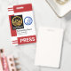 Cover features a pair of red column stripes at the top and bottom of the badge. At the left wall of the badge is a special placard that holds a photo template. Here you can upload photos that measure 1,000 x 1,200 pix. That special column that holds your photo will help if your photo background is white. To the right side of the photo is an optional blue globe logo that you can use. The logo is based on a "broken world" design concept. This is followed by your prestigious name, job title and the employee number at the bottom. A caption "PRESS" can be found near the base at the lower right corner, change this to suit your service needs.