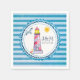 Paper napkins with a nautical theme. Designed on a blue striped pattern and a circular nautical frame layered over top. A red striped lighthouse and a beach ball, with a smiling sun and seagull flying off in the distance. Personalize with your initials and wedding date.