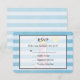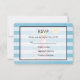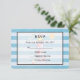 A wedding RSVP card with a nautical theme. Designed with a blue striped pattern and a semi-transparent frame with a black border layered over top. A red striped lighthouse and a beach ball, and a smiling sun and flying seagull off in the distance faded in the background.