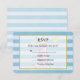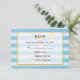 A wedding RSVP card with a nautical theme. Designed with a blue striped pattern and a semi-transparent frame with a gold border layered over top. A red striped lighthouse and a beach ball, and a smiling sun and flying seagull off in the distance faded in the background.