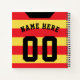 This design is an scocer (football) / rugby / sports style jersey with buttoned collar, and red horizontal hoops / stripes, the background colour can be changed, just click on 'CUSTOMIZE'.