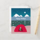 This Christmas postcard has a red tent at a lakeside campsite with snow-capped mountains in the background all under a starry sky with a full moon. This camper is ready for Santa and has hung a green and white stocking on the tent. Text says Happy Holidays. Cute holiday card for people who love to be outdoors.