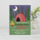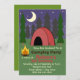A birthday camping party invitation featuring an illustration of a red tent with evergreen trees in the background. Stars and moon in the sky, campfire in front of tent. Personalize the text with details of your occasion.