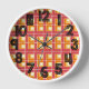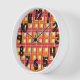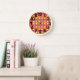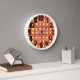 This clock has a geometric design of L's in red, orange, and yellow, placed in different directions on a field of white.