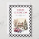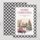 Black and white buffalo plaid Merry Christmas card featuring a winter scene with a retro red truck.