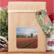 Photo sticker with a spring landscape with a field with red tulips and other flowers and a windmill during sunrise in the Keukenhof gardens, Bulb Region, the Netherlands.