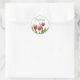 This round sticker features a pretty green scripted name over a set of red tulips flowers with an inset circular dark green border.