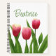 A set of red tulips flowers blooming on a white background with your own name in a scripted green font.