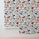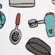 Quirky kitchen peel and stick wallpaper with hand drawn cooking utensils, kitchen wares, and more in a retro colour palette of turquoise and tomato red. Peel and sticker wallpaper for your kitchen with a charming pattern of illustrated kitchen wares in a hand-drawn style in tomato red, turquoise, and beige.