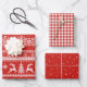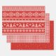 Christmas gift wrapping paper set feature ugly Christmas sweater pattern, buffalo plaid and stars pattern on colour editable red background.