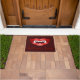 This doormat features Destei's cartoon illustration of a vampire mouth. The lips of the mouth are red and the teeth including fangs are white. The background colour is burgundy red / dark red. Under the image there is a personalizable text area for a family name or for a Halloween theme greeting, for example.
