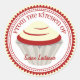 A kitchen label featuring an illustration of a red velvet cupcake with white icing inside a decorative red and white circle with red text "From The Kitchen Of" Personalize with your name.