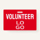 This custom identification badge features the title "Volunteer" printed in a large white font over a red background. A sample company or business logo is placed in the centre which you can replace with your own custom logo or other image. The back of the volunteer ID badge contains contact details and additional information.