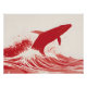 A bold, graphic illustration featuring a striking silhouette of a majestic whale breaching powerfully from stylized waves. The whale is rendered as a solid silhouette in a deep, dark shade of red (or stark white, depending on background), defined solely by its outline against a vibrant, energetic backdrop. The background consists entirely of dynamic, stylized waves crashing and undulating, using contrasting shades of vivid red and bright white to evoke movement, depth, and raw energy. The water surface and splashes follow the same strict color scheme, emphasizing high contrast and minimalist design. The overall style is powerful, energetic, and abstract, capturing the raw force of the whale’s breach in a striking, silhouette-driven composition.