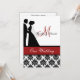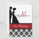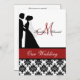 Black and white damask print with a red band, a silhouette bride and groom, and areas you can personalize with your names, monogram initial, wedding ceremony and reception information on a customized wedding invitation that's classy and traditional all in one!