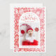 Whimsical joyful holiday card features hand drawn festive Christmas celebration illustrations in watercolor red color, with personalized family photo, modern and fun.
