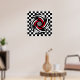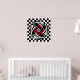 An eye-catching abstract, a swirl of black and white with bright red accents on a checked background.