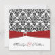 This red, white, and black damask wedding invitation has a red PRINTED ON ribbon and jewel brooch that would be perfect for a black and red themed wedding. The text and paper is all customizable. If you require any other matching items, such as photo cards, keychains, etc. please email your request to niteowlstudio@gmail.com. Existing matching items are shown below. ****Please note that only the small RSVP card shown below will fit inside the envelope for this invitation.