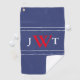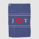 Looking for a personalized father's day gift? This patriotic golf towel has a red monogram on a blue background. There's a large red letter in the middle and a white initial on either side of it.