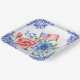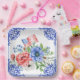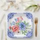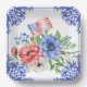 This paper plate design has a red white and blue colour scheme with decorative corners and and beautiful watercolored floral bouquet with an American Flag in the centre.