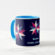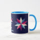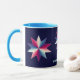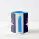 This lively patriotic mug sports three simple pinwheel patterns of red, white and blue in the shape of a star. The text reads: Show your colours! It can be customized or removed.