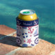 A colourful nautical pattern is the feature on this personalized can cooler. Images include an anchor, a ship's wheel, a life buoy, a sailboat and a pennant. The images are in red and blue, and placed on a white background. At the top is a solid navy section bordered in red. The top section has your name in white between two white anchors.