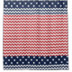 Patriotic red, white, and navy blue shower curtain with white polka dots on navy, white and navy chevron stripes, and red and white chevron stripes.