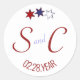 This sticker features the bride and groom initials in red with wedding date and red, white, and blue stars at the top. Personalize the text in the template fields or customize to select a font style, size, and colour you prefer. Great for sealing mail or favour bags.