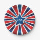 A patriotic design in bold red, white, and blue sunburst stripes with a blue star frame and USA monogram. This paper plate is a great choice for sporting event parties and patriotic celebrations. You can replace the "USA" monogram with any other text by editing the sample text shown in the design template. If you need to change fonts and font sizes, simply use the "Customize It" button and make your changes. Get the matching paper napkins here: