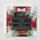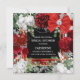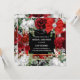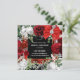 A beautiful deep red square border frame is edged with faux gold and has delicate white and deep red watercolor roses nestled on eucalyptus leaf foliage. A pretty red satin bow with a faux diamond inlay appears across the top right corner and a delicate faux silver strand rests below it. There are white templates on black for your personalized wording. These may be customized to suit a bridal shower; birthday party; special anniversary or for a festive Christmas in July holiday party.