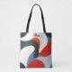 A modern, abstract design consisting of curved colour blocks of red, white, blue, and black make this tote bag stand out.
