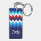A monogrammed acrylic rectangular keychain featuring a colourful, trendy pattern design of red, white, and blue chevrons. Create the perfect customized gift by clicking the “personalized” button to add a name or custom message in the provided template field. Select the “click to customize further” link to change the font, text size and more.